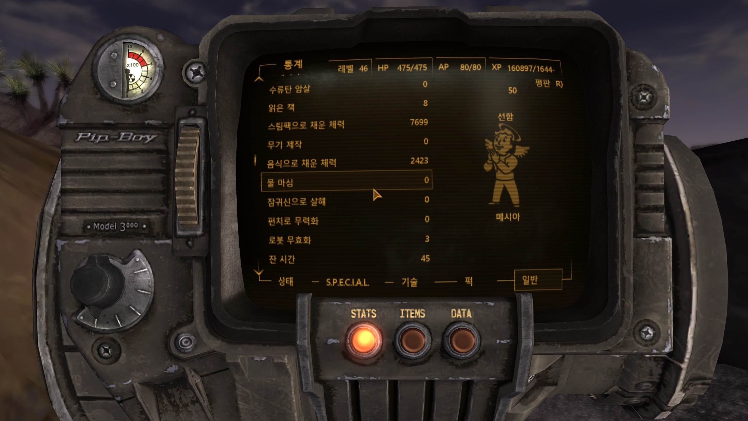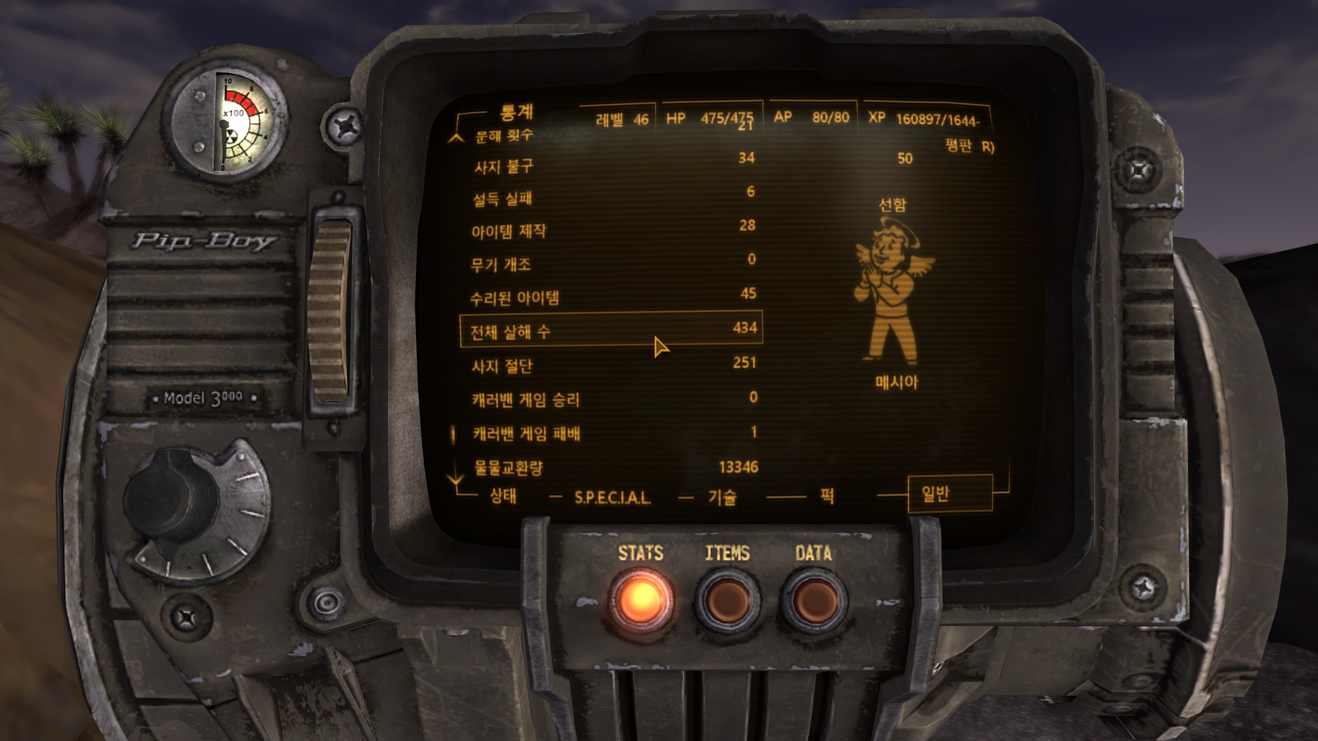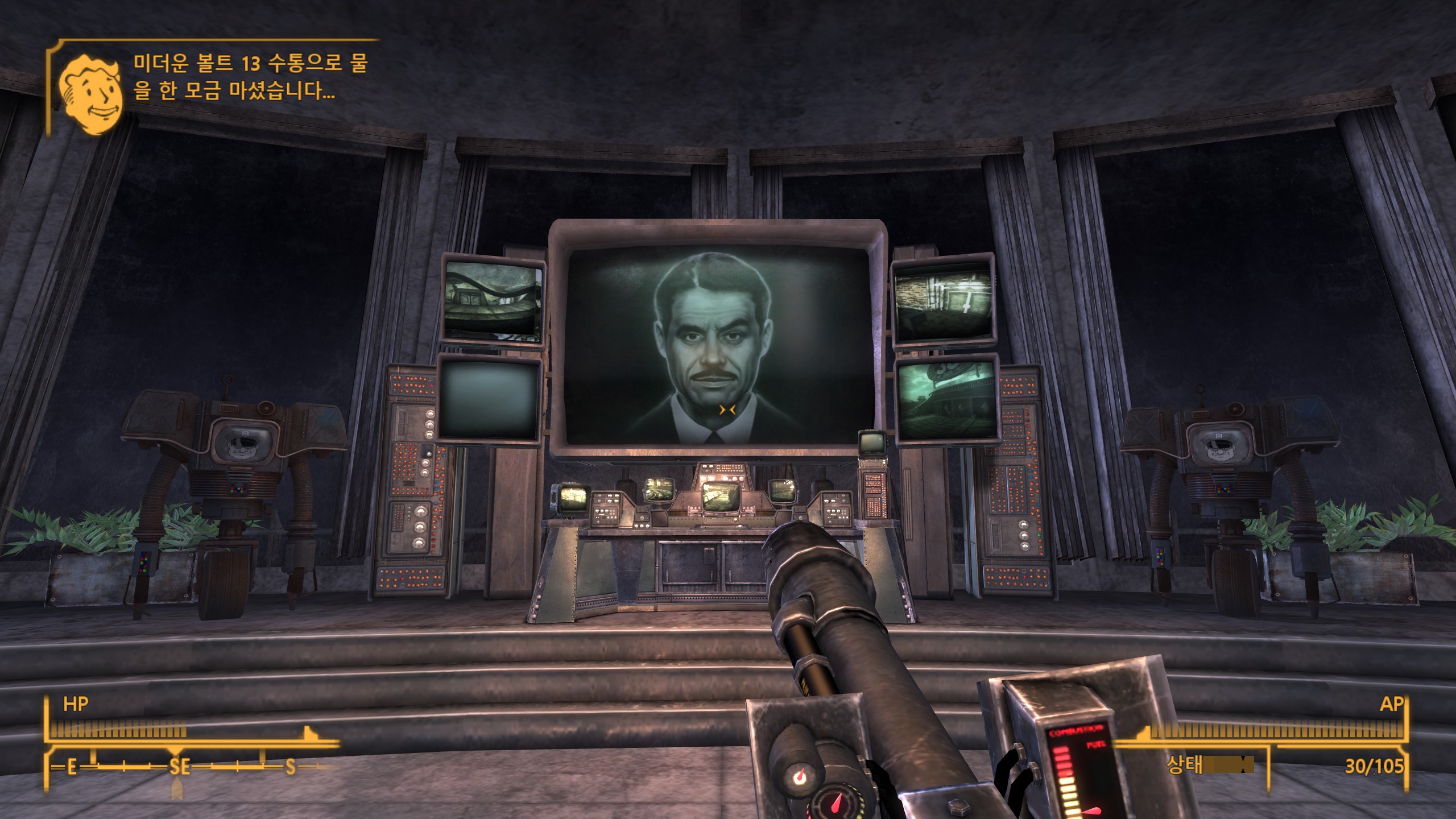 결국 NCR엔딩을 보려 한 나는 NCR의 좋지 않은 모습을 봐버렸다. 결국 예스맨 엔딩을 선택해 버렸다. 미스터 하우스는 또 믿을 수 없어서 죽여버렸다. 예스맨을 통한 내가 지배하는 엔딩을 선택해 버리는.. 재미있었다. 이것저것 할 수 있었고, 다른 엔딩도 확인해보고 싶은 마음도 있지만, 보니까 엔딩의 종류도 많을 것 같고.. 그래서 그냥 여기까지 하고 그만뒀다. DLC도 마저 플레이하고 자체 완.