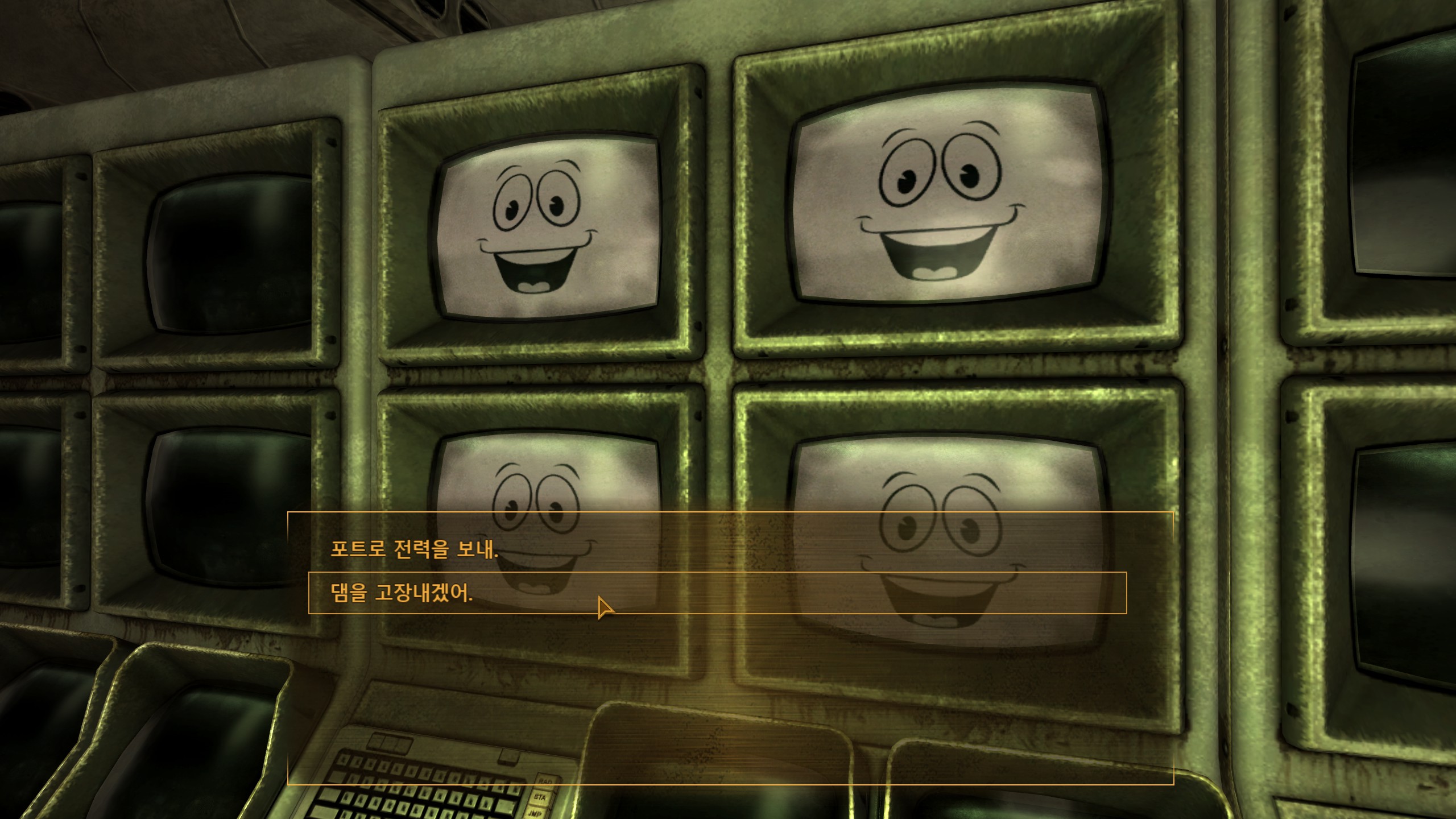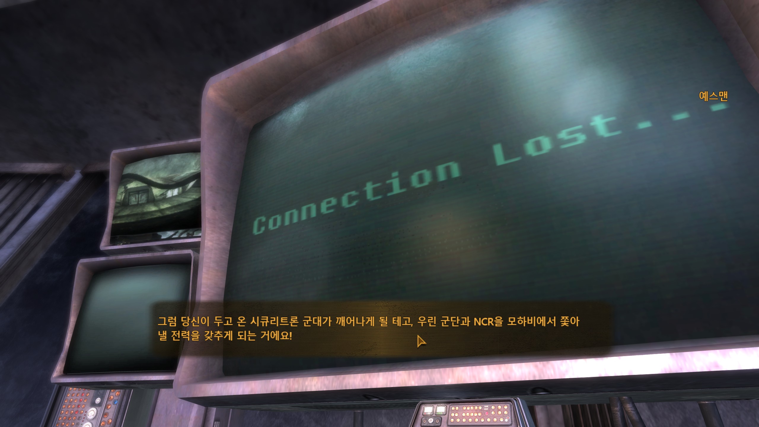 자원을 중요시하는 NCR이 후버댐의 발전기가 없으면 여기에서 떠날 것이라는 예스맨. 정말 NCR은 자원만 보는 조직이라는 것을 잘 보여주는 문구.
