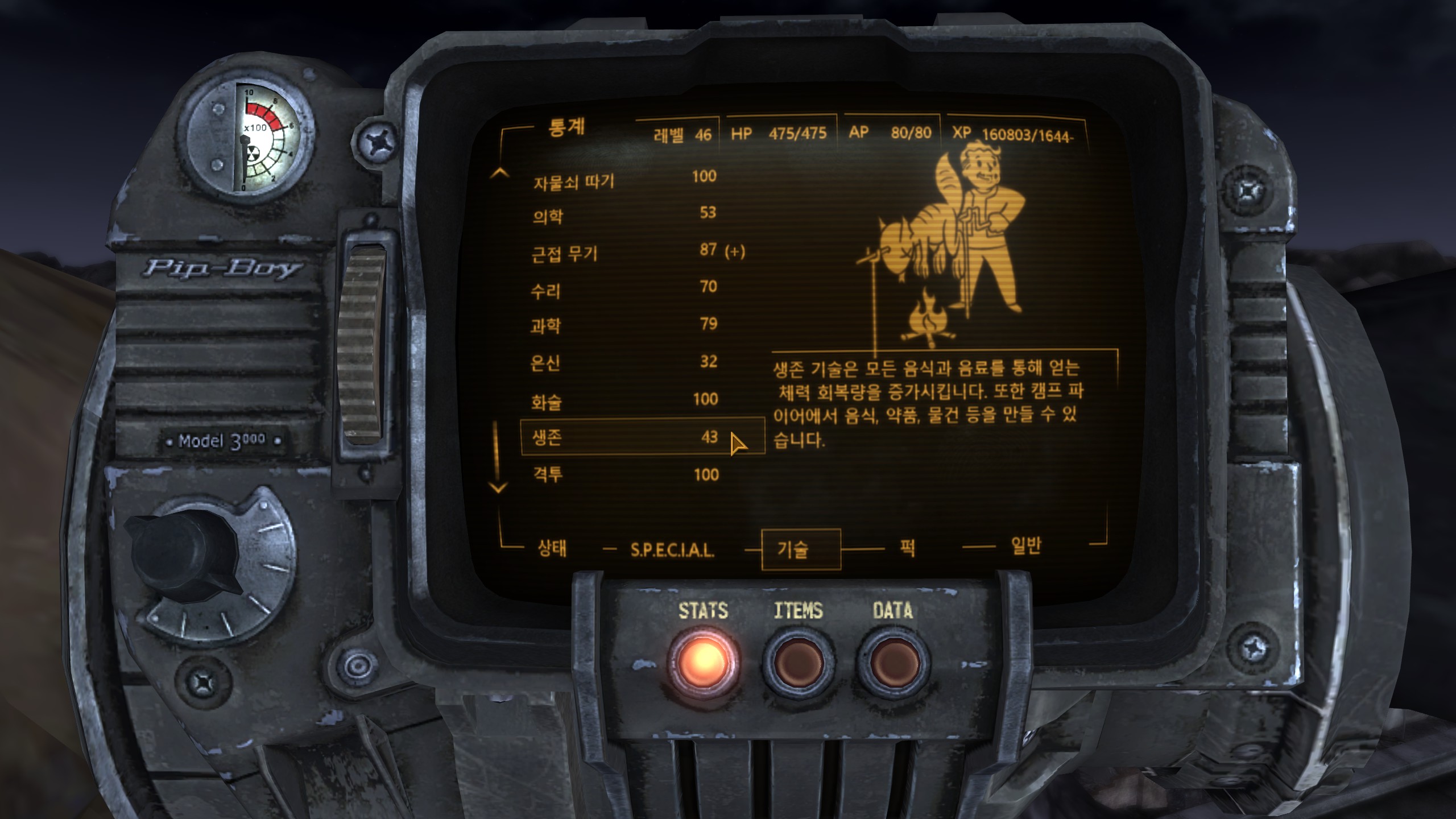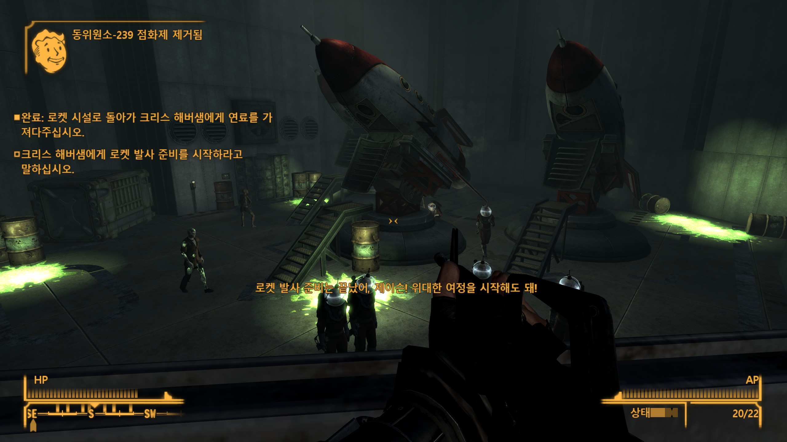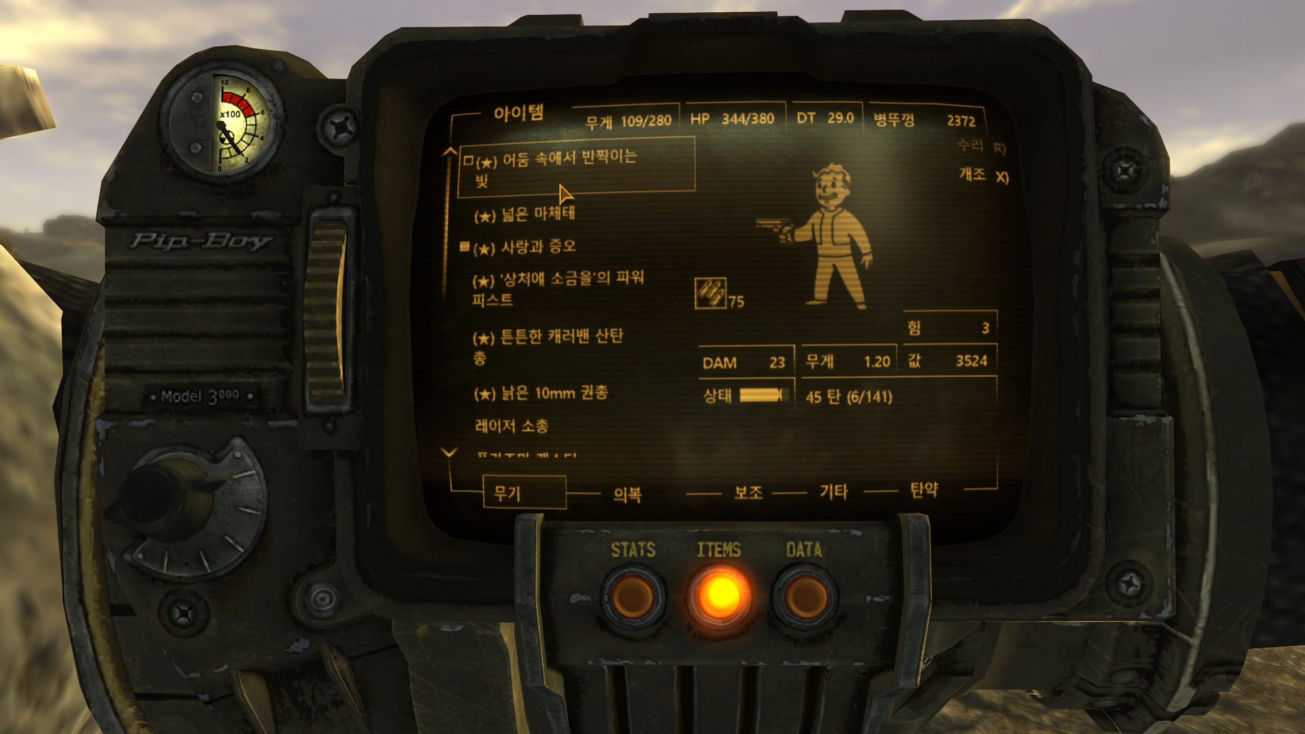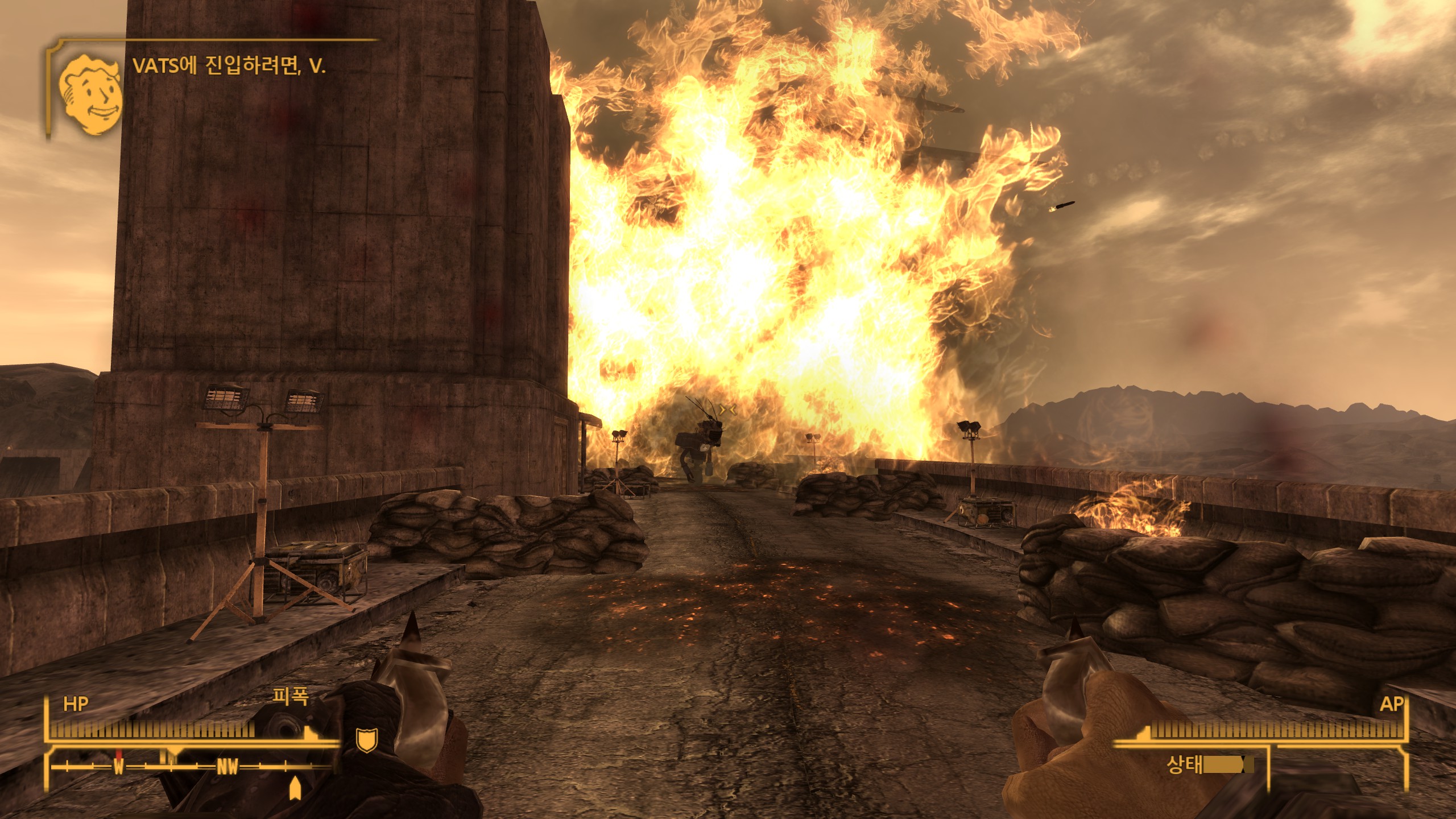 폴아웃4보다 아쉬운 부분이다. 솔직히 폴아웃: 뉴 베가스와 폴아웃4의 출시일은 5년의 차이가 있다. 이 5년 사이 폴아웃의 발전은 어쩔 수 없지만, 폴아웃 뉴베가스에도 있었으면 하는 컨텐츠들이 여럿 있다. 빌리징, 총기 업그레이드, 다양한 총기류, 폐지 줍기 등등.. 내가 언급한 모든 부분이 뉴 베가스에서 경험하기 어렵다. 여러 템을 줍고 그 템을 가지고 내가 쓰고 있는 총을 업그레이드해서 강해지는 맛이 있었는데 그 부분을 느끼기 쉽지 않았다. 많은 동료를 모으고, 그 동료를 이용하여 강해지고 그런 부분도 아쉬웠다. 나중에 언급하겠지만, 그렇기에 뉴 베가스의 리메이크를 원하는 것이다..