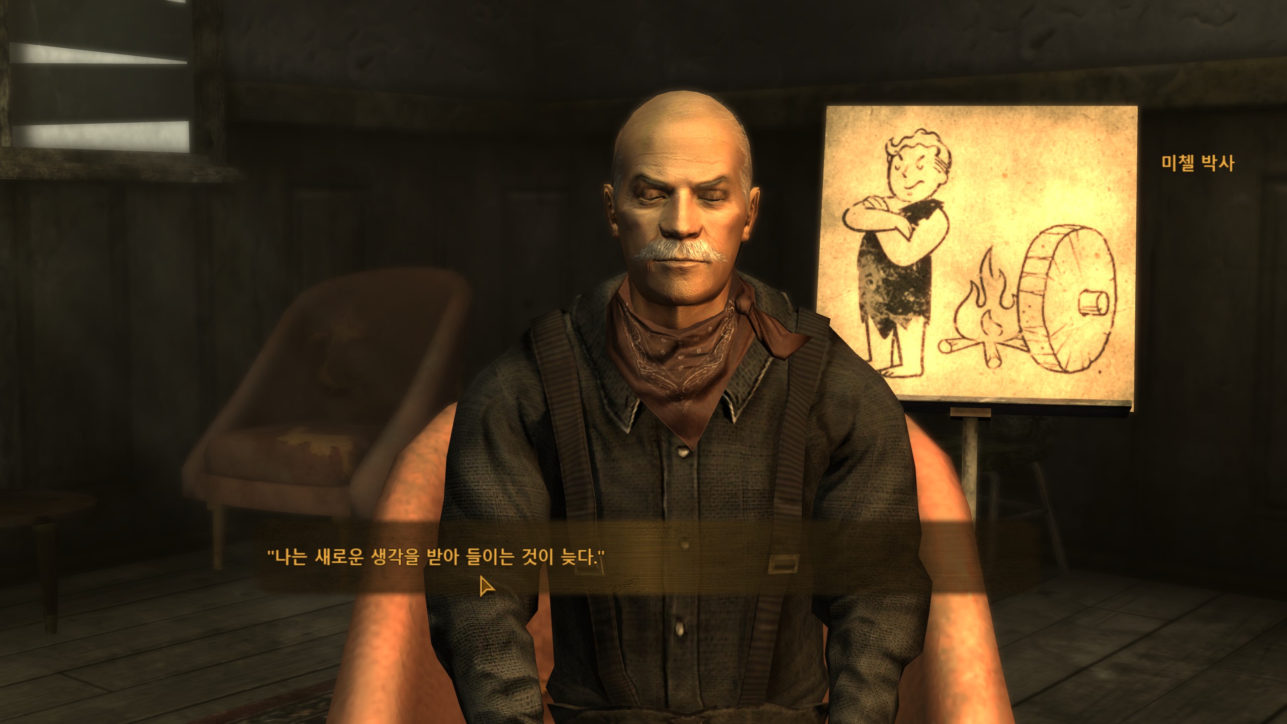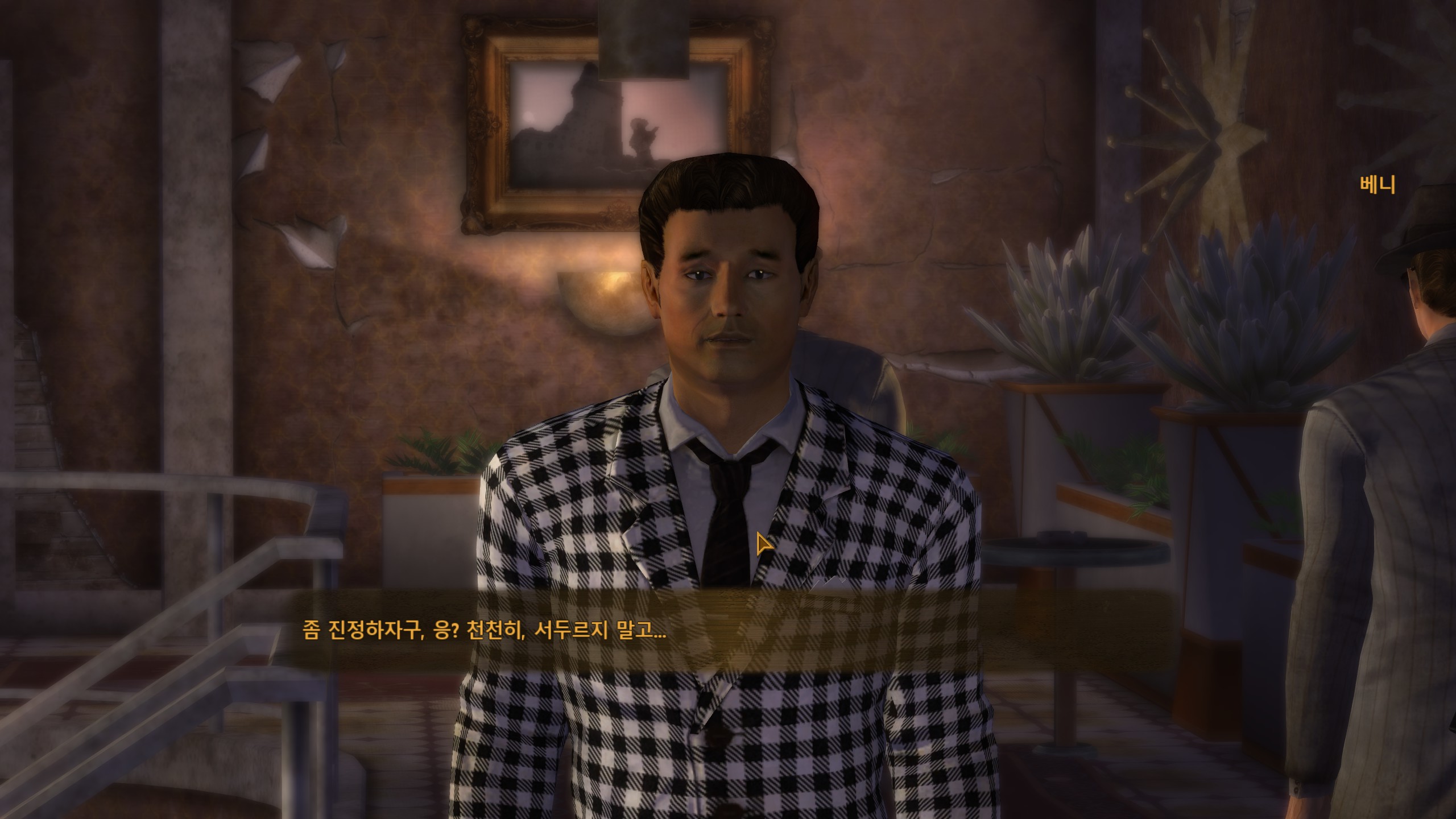 그렇게 만나게 된 미스터 하우스와 베니. 베니는 여기에서 죽이고 싶었겠지만,, 죽일 수 없었다. 미스터 하우스와도 여러 말을 하면서 여러 계획을 듣게 된다.